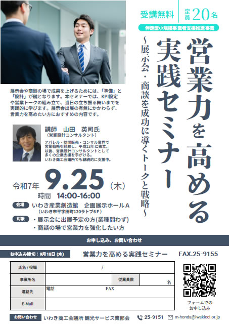 営業力を高める実践セミナー 2025年8月20日 最終更新日時 : 2025年8月20日 520@admin 営業力を高める実践セミナー 展示会・商談を成功に導くトークと戦略 令和7年9月25日(木)時間:14:00~16:00会場:いわき産業創造館 企画展示ホールA(いわき市平宇田町120ラトプ6F対象:展示会に出展予定の方(業種問わず)商談の場で営業力を強化したい方